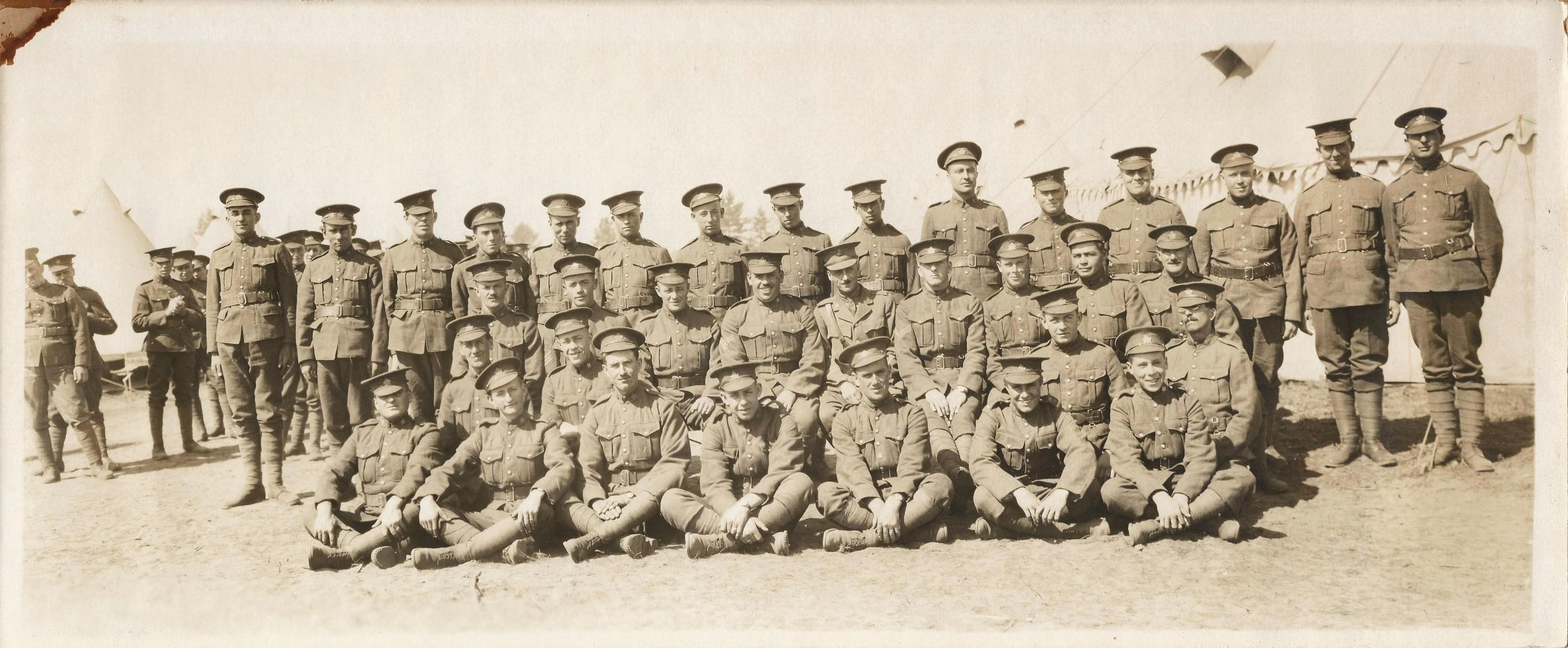 Description: Back row (l-r): D. McClinchey, Unidentified, H. Whitmore, J.C. Hutton, Jim Priest, Unidentified Sergeant, Neil Sparks, Unidentified, Harry Johnston, Milton J. Cook ..Front row (l-r): Unidentified Corporal, Bill McNaughton, F.G. Thompson, William Appleby, Unidentified, Chas Thompson, Unidentified, Unidentified, Bill Sloman...Date: 1916...Object ID : 2007.0062.157.